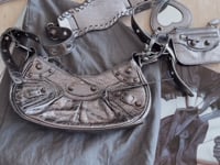 -This is the dazzling silver metallic Balenciaga Le Cagole XS Leather shoulder bag