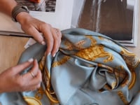 -Over a pale blue base, this scarf features gold printed patterns of chains, pocket watches and horses.