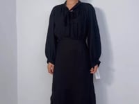 -Featuring a stunningly classic black colour, this maxi dress offers timeless sophistication with a pussy bow neck tie and A-Line skirt.