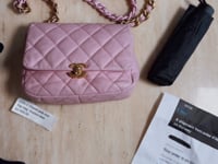 -This is the Chanel Small Pink Lambskin Flap Bag , a highly sought-after piece