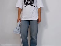 -This preloved Christian Dior T-shirt from the exclusive Thebe Magugu X CTAOP collaboration features a sleek white design and a striking black image printed on the front.