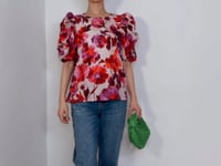 -This Essentiel Antwerp Pink Floral Blouse in the style Henrietta exemplifies understated luxury with its puffed shoulder silhouette and impeccable tailoring.