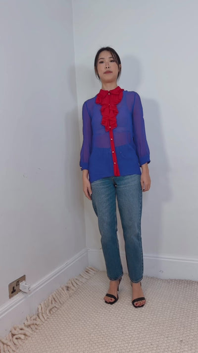 -The blouse has ruffle details in the same tone of red down the front.