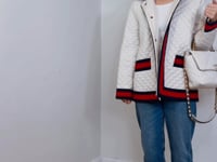 -This iconic Gucci White Quilted Hooded Jacket with the famous red and navy stripes is a true investment piece that transcends seasons.