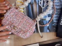-This is the Chanel Pink Tweed Pearl Handle Mini Flap Bag