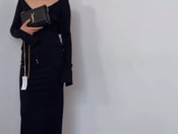 This black evening gown from 16 Arlington, British luxury fashion house founded in 2018. Features full length sleeves with slits, a peep hole cut out to the front and an open back. Tie detailing to the front and back featuring silver appliqués. Stretchy black fabric, fishtail train to the back. Ultra modern gown, perfect to wear to an evening event.