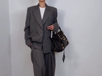-Crafted from a luxurious slate grey wool blend, adorned with skinny white pinstripes and featuring brown marbled buttons, this blazer exudes elegance and sophistication.