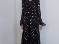 -This gold polka dot long evening gown features a relaxed silhouette and elegant long sleeves.