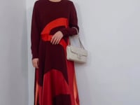 -The silk maxi dress showcases the brand's signature eccentric design with a burgundy base and lighter red satin panels, paired with a refined rounded neckline for timeless elegance.