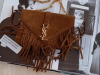 -This is the Saint Laurent Brown Suede Fringe Bag, the epitome of bohemian chic