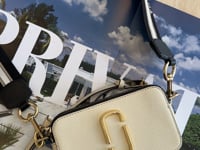 The Marc Jacobs Snapshot Bag is a popular bag known for its compact size, bold design, and versatility. In contrasting white and black leather with gold hardware, this bag is spacious enough for all your daily essentials.