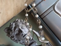 -This is the Weekend Max Mara Pearl Necklace. It features an artsy, cylindrical gold hardware detail set between the pearls.