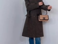 -This Yves Salomon brown tweed coat epitomises timeless elegance with its expertly tailored double-breasted silhouette and tortoiseshell buttons.